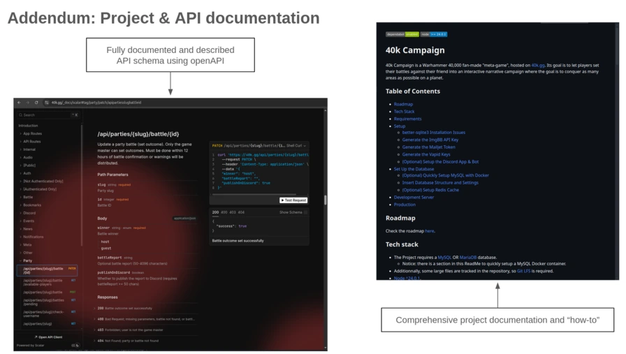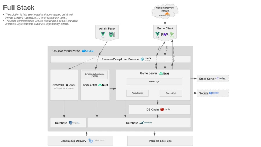 I'll get a bit technical here, so this paragraph might be a string of acronyms and odd names, but here goes: the solution is hosted on a small VPS (Virtual Private Server) that I administer myself. Sysadmin work isn't my forte, but I know enough to be reasonably paranoid and extremely careful about server security! The 40k.gg ecosystem runs on a Docker infrastructure orchestrated by Traefik as a reverse proxy, partly because I appreciate Traefik's automatic certificate issuance, and combined with Docker, the load-balancing capabilities allow for simple scaling if needed. The application core is a Node.js server using the Nuxt framework, which I find convenient for handling many things I need: game logic, the API, internationalization, site rendering (both server-side and distributing assets for client-side rendering), scheduled jobs, security headers and CSRF tokens, and so on. For data, I chose MariaDB because I value guaranteed data consistency—something a good relational database excels at, and MariaDB is a well-proven solution. Where relational databases are less stellar is performance, which is why I added Redis as a cache layer for data that might be frequently requested by users (like zone states), sparing the database from being bombarded with rapid queries. A separate back-office, also built with Nuxt, handles administration and control.
