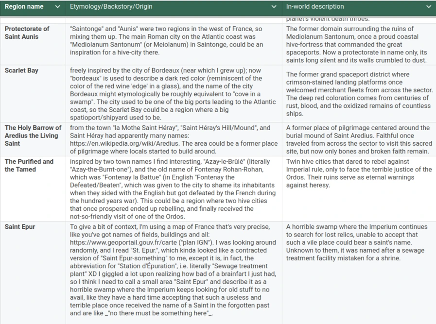 So I created resources to systematize this approach, get some "consistent" inspiration to build upon. You can find the complete "etymology" or origin of Ulmyllon's region names here. As a few anecdotes, I'm including some screenshots, but I want to linger on one particularly silly case that makes me laugh and which, to me, is reminiscent of the irony and humour that have always existed in this otherwise grim setting: while scouring maps for inspiring place names, I came across "St. Epur." and wondered about it. For those who don't know, place names based on "Saint So-and-so," often abbreviated "St So-and-so," are absolutely everywhere in France. Used to this, I thought "Epur? What kind of name is that?"... before realizing it was the abbreviation for "Station d'Épuration", which means Sewage Treatment Plant. The irony of this brain fart of mie was too good not to use: Saint Epur becomes a pestilential swamp where the Imperium stubbornly searches for relics, unable to accept that such a vile place could bear a saint's name, even a forgotten one.