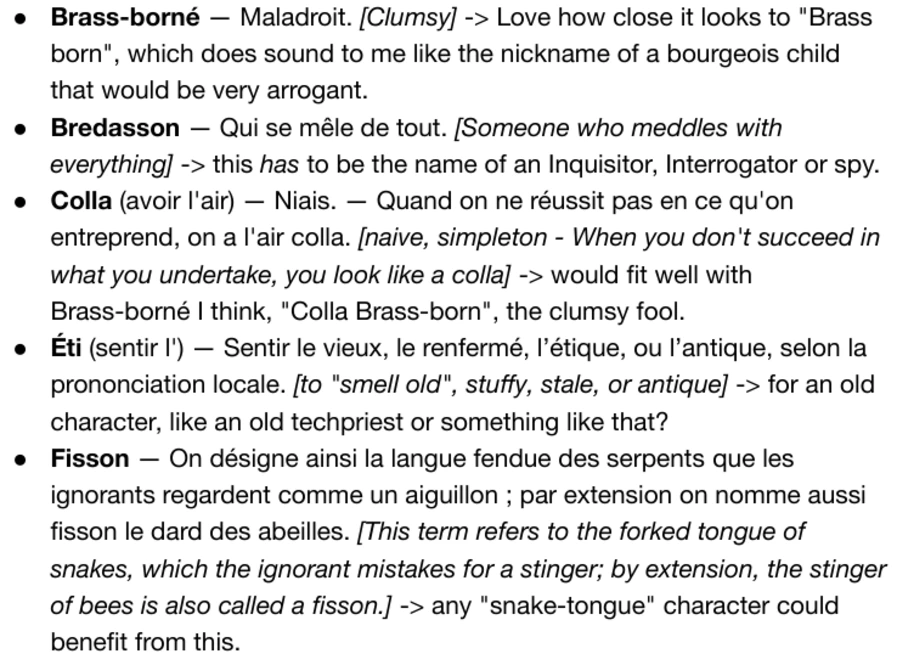 The local dialect, the Poitevin, also offers treasures. Bredasson is "someone who meddles in everything", and so it was destined to become an Inquisitor's name. Brass-borné, the clumsy one, sounds to me like the nickname of an arrogant bourgeois child. Fisson, which refers to a serpent's forked tongue, will suit perfectly a character with a viper's tongue. I'm including a small excerpt from the glossary I've compiled but won't publish it in full: it still contains narrative elements yet to come, and certain secrets hidden on the site that I'd rather not spoil!